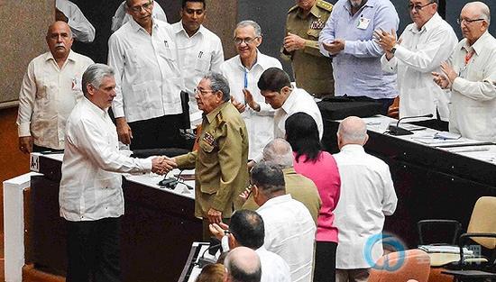 6月2日,古巴全国人民政权代表大会特殊会议,迪亚斯-卡内尔(左)和劳尔握手。