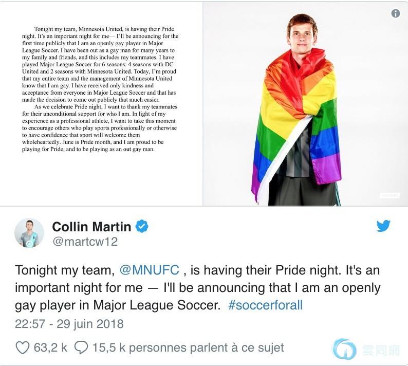 6月是全球同性恋群体的“自豪月”,美国当地时间6月29日,科林-马丁身披彩虹旗在社交媒体上公开留言称:“今晚明苏尼达联将迎来属于我们的自豪之夜。借此机会,我在这里宣布我是一名效力于美职联的同性恋球员。”