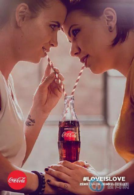 广告牌中分别是 异性,同性之间同喝一瓶可乐的画面 。并且下方带有# Love is Love #的话题标签。