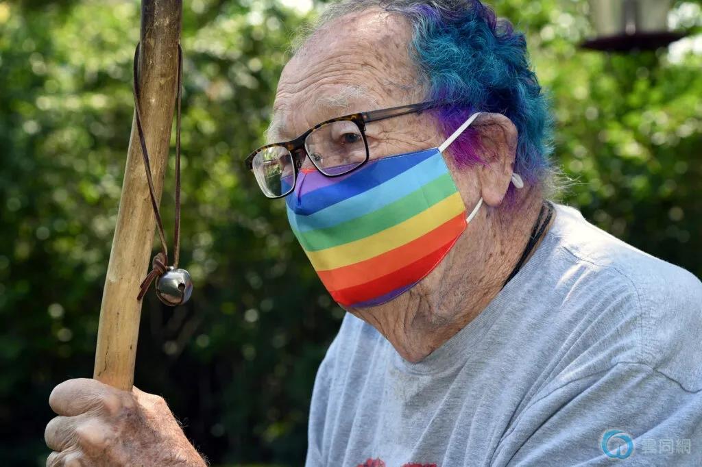 一位朋友把费尔茨的头发染成蓝色和粉红色。穿了一生的保守衣服,他有了一系列新的彩虹衣服。他很高兴穿上。