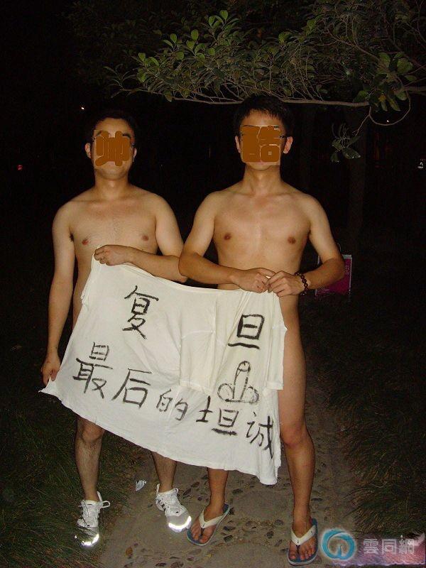 “最后的坦诚”:裸奔庆毕业28日下午,署名为“我只有天晓得”的网友在论坛发表了《复旦学子裸奔庆毕业,哥们儿真牛》的帖子,介绍该校有两名毕业生深夜在校内裸奔庆祝毕业,并上传了数张照片。照片中,两名男生全身赤裸,手拿一张写有“复旦,最后的坦诚”字样的白布,分别在复旦大学校门、校训等多个地方留影,照片仅在隐私部位做了遮挡处理。其中两人裸体背对镜头在校门口拍的那张照片,头上都戴有学士帽。