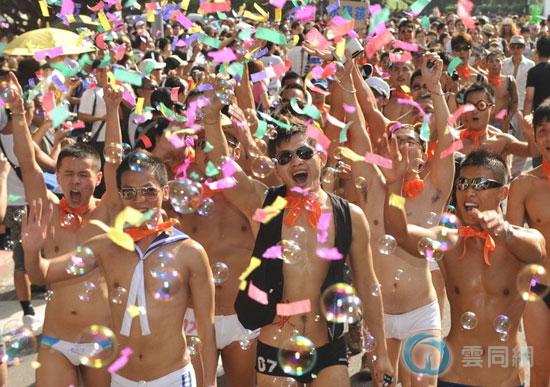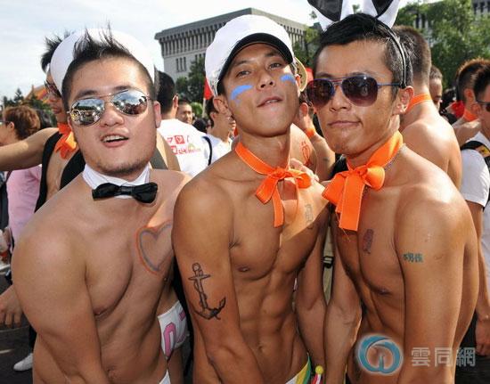 半裸的同性恋者穿过街道。此次游行堪称台湾历年来最大规模的同志嘉年华活动。