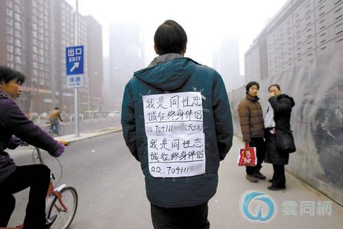 社会压力下,同性恋者不得不为婚姻问题头痛。图为一同性恋者在街头寻找伴侣