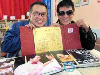 申请同性结婚登记遭拒的陈敬学(右)与高治玮,两人拿着“幸福卡”甜蜜合影。