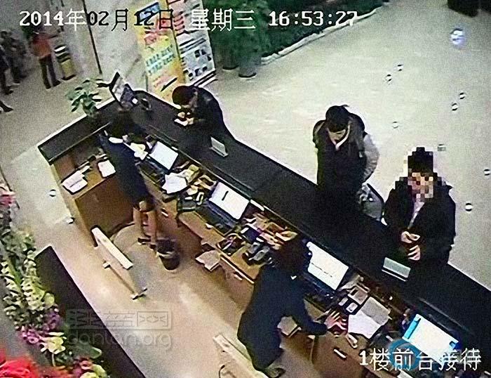 监控录像显示杜男(右)与项姓男模(右2)登记入住酒店