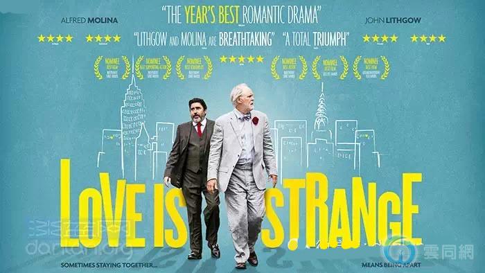 电影《爱很怪》中,一对老年同志情侣在合法登记结婚之后,却面临一系列的经济危机,两位主角不得不蜗居在小辈的家中,逐渐地,他们感觉自己成了累赘。影片被法国《电影手册》评为2014年十佳电影之一。
