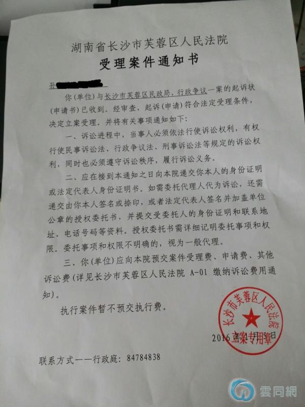 湖南省长沙市芙蓉区人民法院受理案件通知书。通知书下方日期显示的是1月5日。  受访者供图