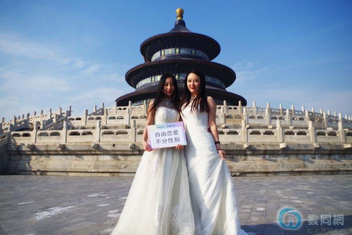 北京天坛,拉拉情侣呼吁“自由恋爱,不分性别”