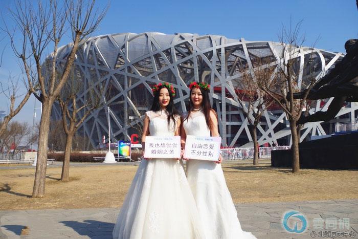 2017年情人节前夕,北京的鸟巢、水立方、北京大学正门、清华大学正门、颐和园正门、国子监、大栅栏、中央电视台总部大楼、五道营、烟袋斜街、前门等地标建筑前出现五对同志(LGBTIQ)“新人”,他们有的身着礼服,有的与新人造型的卡通展板合影。他们手上的Slogan表达了支持婚姻平权的主题。