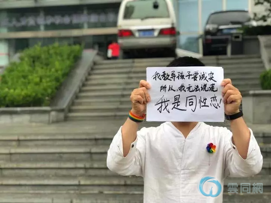 9月19日,明珏前往青岛市的劳动人事争议仲裁庭递交一份申请书。接着,他在庭外手举一张标牌,上头写着:“我教导孩子要诚实,所以我无法说谎。我是同性恋。”