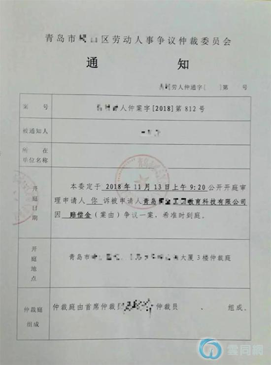 9月27日,青岛市劳动人事争议仲裁委员会正式立案。明珏收到了仲裁庭的通知书。通知上写着开庭日期、地点与“赔偿金”事由。