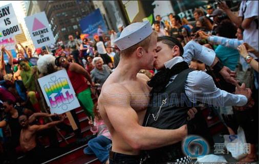 此次集会中最引人注意的是一众英俊性感的百老汇演员,他们在时代广场载歌载舞,并摆出男男版“胜利之吻”造型,引起一片欢呼。