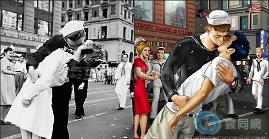 资料图:庆祝二战胜利的新闻摄影作品“胜利之吻”(左)及男男版漫画