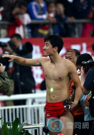 2009年10月25日,刘翔在全运会110米栏决赛中以13秒34的成绩成功夺冠,实现了全运会的三连冠。赛后,为感谢现场观众,刘翔绕场了一周,并把自己的战袍扔给了看台上的观众。而观众似乎对赤裸着上身的飞人有着更浓的兴趣,有的观众甚至拿出了绿激光照在飞人的身上。!@!pyg#]9c(]333544