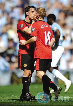 众所周知,曼联队长加里·内维尔历来就是一个内敛低调、根本不会作秀的人,是敬业称职的老队长。但在昨天的比赛中,在目睹队友斯科尔斯绝杀死敌曼城后,性格不外露也不张扬的内维尔也是欣喜若狂。于是,在曼城城市球场当着48000人的面,内维尔突然走到队友斯科尔斯面前,用手抚住后者的脸颊,接着一口就亲吻在后者的嘴唇上。斯科尔斯显然也被这突如其来的亲吻搞得很意外,但随即见惯“大场面”的“生姜头”斯科尔斯,也像个被热恋中的男友激吻的小女人一般,仰着头享受比他高的内维尔的“吻贺”,左手甚至还很配合地“搭”在内维尔的球衣上。这令人非常意外且滑稽雷人的一幕,绝对是“雷”爆全场。
