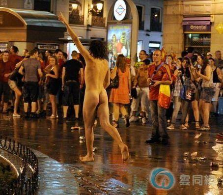 西班牙球迷马德里街头裸奔庆祝西班牙1:0德国晋级南非世界杯决赛,西班牙本土的球迷兴奋异常,各地都是欢庆的人群,在马德里更是有球迷全裸奔庆祝。