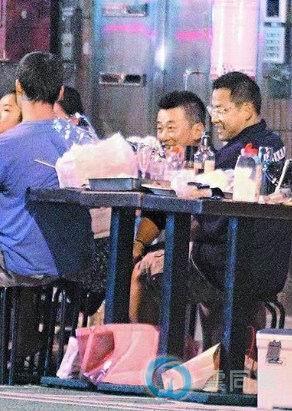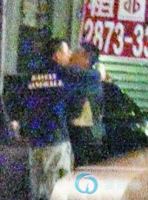 江宏恩(左)和平头男提着淡水买的餐点外出,江托着下巴专心听他讲话。