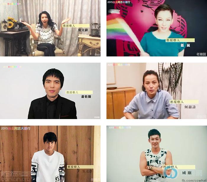 莫文蔚在视频中说:“10月31日,我支持你们,Love Wins!”萧敬腾表示:“10月31日是我们盛大的日子,因为我觉得这是一个属于我们大家的节日。”已经出柜的香港女歌手何韵诗曾参加过台湾同志游行,她在视频中说:“那天看到大家对爱的表达,我是非常感动的,希望大家今年可以为不同的爱、不同的人加油!”