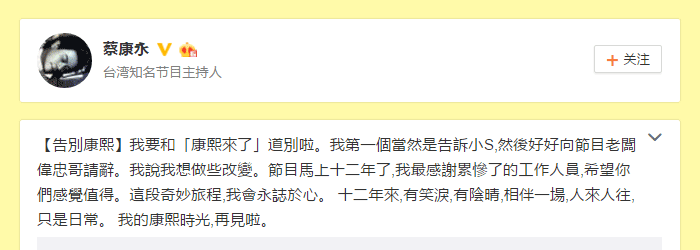 但昨天,蔡康永在个人微博上发文称自己将告别《康熙来了》,结束与《康熙来了》近12年的缘分。蔡康永说:“我要和《康熙来了》道别啦。我第一个当然是告诉小S,然后好好向节目老板伟忠哥(王伟忠)请辞。我说我想做些改变。节目马上十二年了,我最感谢累惨了的工作人员,希望你们感觉值得。这段奇妙旅程,我会永志于心。十二年来,有笑泪,有阴晴,相伴一场,人来人往,只是日常。我的康熙时光,再见啦。”蔡康永还晒出一张与老搭档小S的合影。