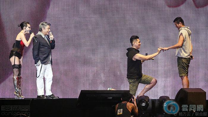 小S的变装皇后造型乐翻全场,她和蔡康永以抽奖的名义促成一对相爱两年多的同志情侣订婚,感动全场粉丝。这对情侣中的Sky对男友Hans说:“宝贝,谢谢你在我的低谷期从未放弃我,谢谢你的关心和坚持。我给你的可能不多,但请你给我机会。我会代替伯父伯母照顾你,让你不再孤单。”