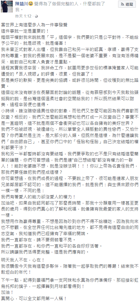 12月10日凌晨,张惠妹的经纪人陈镇川在Facebook分享自己对婚姻平等的看法,并以“我”和“我们”谈论同性伴侣和出柜话题,表明自己是同志。他在文末写道:“真开心,可以全文都用第一人称。”