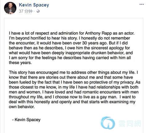 近日奥斯卡影帝凯文·史派西被指30年前曾性骚扰《星际迷航:发现号》男星拉普,他发文表示自己并不记得有这样的行为,如果真的发生过这件事,他对此真诚地道歉——最后正式表明了自己的同志身份!!