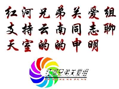 红河兄弟关爱组支持“云南同志聊天室的申明” 红河兄弟关爱组支持云南同志网有关聊于室情况的声明,同时也对某些别有用心的人用如此下流手段恶意抢夺云南同志网聊天室表示愤怒!在此我们提醒云南各MSM小组和正直的同志朋友们注意,如果让这种内心险恶、别有用心的人控制了聊天室,将让一个曾经健康安全的同志聊天室充满欺诈、也会让在里面聊天交友的同志朋友面临各种各样的危险。我们希望碧聊应该认真查明真象,不要让同志人群中这些败类的阴谋得呈。还云南同志一个干净、安全的交友天地。 红河兄弟关爱组